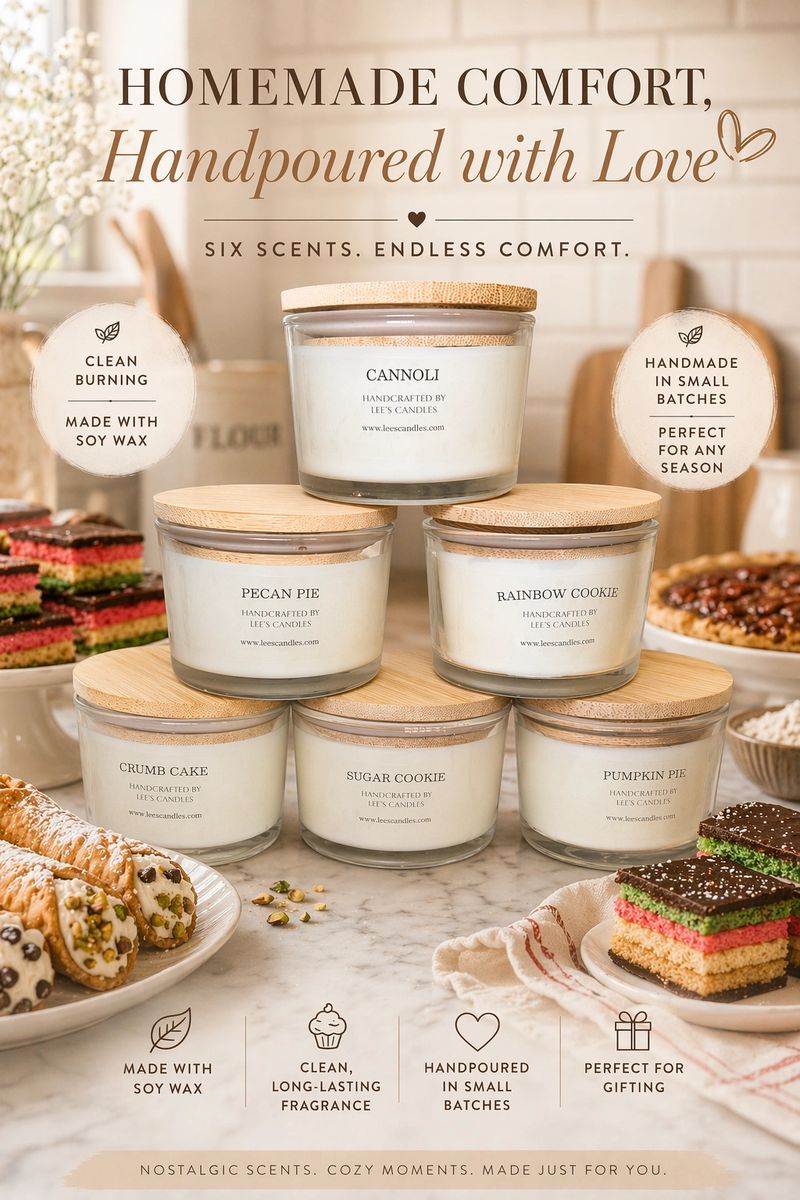 Meet Lee’s Candles woman owned, small-batch candles inspired by your favorite bakery treats. Choose a preset 3‑pack or mix any 3 scents for $15.